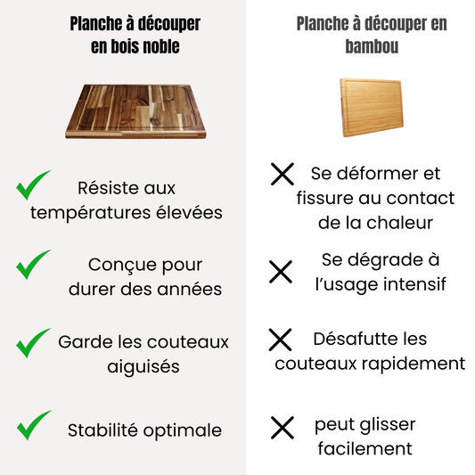 Nettoyage planche : À l'eau tiède avec une éponge douce, séchez immédiatement pour une hygiène optimale. Ne pas mettre au lave-vaisselle, ne pas laisser tremper, ne pas utiliser de nettoyants abrasifs qui pourraient déformer ou assécher le bois. Une fois par mois, passez une fine couche d'huile alimentaire (lin, pépins de raisin, huile spéciale bois) pour nourrir la surface, conserver sa protection naturelle et garantir une durabilité maximale. Si des traces légères se forment, un léger ponçage au grain fin suffira à lisser la surface. Bien entretenue, votre planche sera encore plus belle avec le temps.